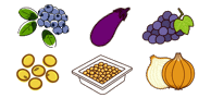 | 赤ワイン・ブルーベリー・なす・カシス・ブドウ (アントシアニン)、大豆・納豆 (イソフラボン)、ターメリック (クルクミン)、米ぬか・玄米 (フェルラ酸)、玉ねぎ (ケルセチン)、カカオ (カカオポリフェノール)、柑橘類の皮やすじ (ヘスペリジン) など