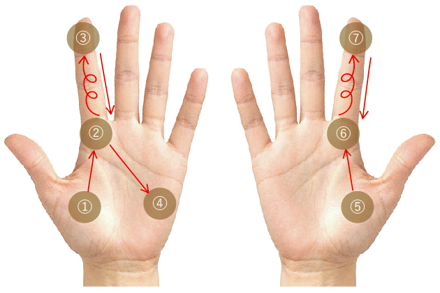 1. 左手の親指で⑤を3秒 2回押し、押しながら⑥に移動して3秒 2回押し、時計と逆回りでクルクルとさすりながら指先⑦まで移動します。