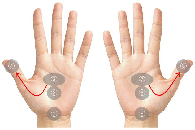 1. そのまま押しながら⑧へ移動して、指先をつまみながら⑧を3秒 2回押し、エネルギーの流れを整えます。